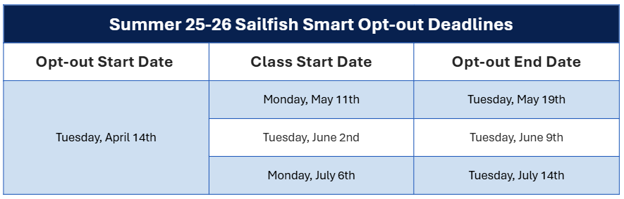 You may opt out of Sailfish Smart for the Summer 2025-26 Semester at PBA starting on Tuesday, April 14, 2026. The deadline to make your selection to opt out is Tuesday, May 19, 2026, if your classes start on Monday, May 11, 2026. If your classes start on Tuesday, June 2, 2026, the deadline to opt out is Tuesday, June 9, 2026. Finally, if your classes start on Monday, July 6, 2026, the deadline to opt out is Tuesday, July 14, 2026.