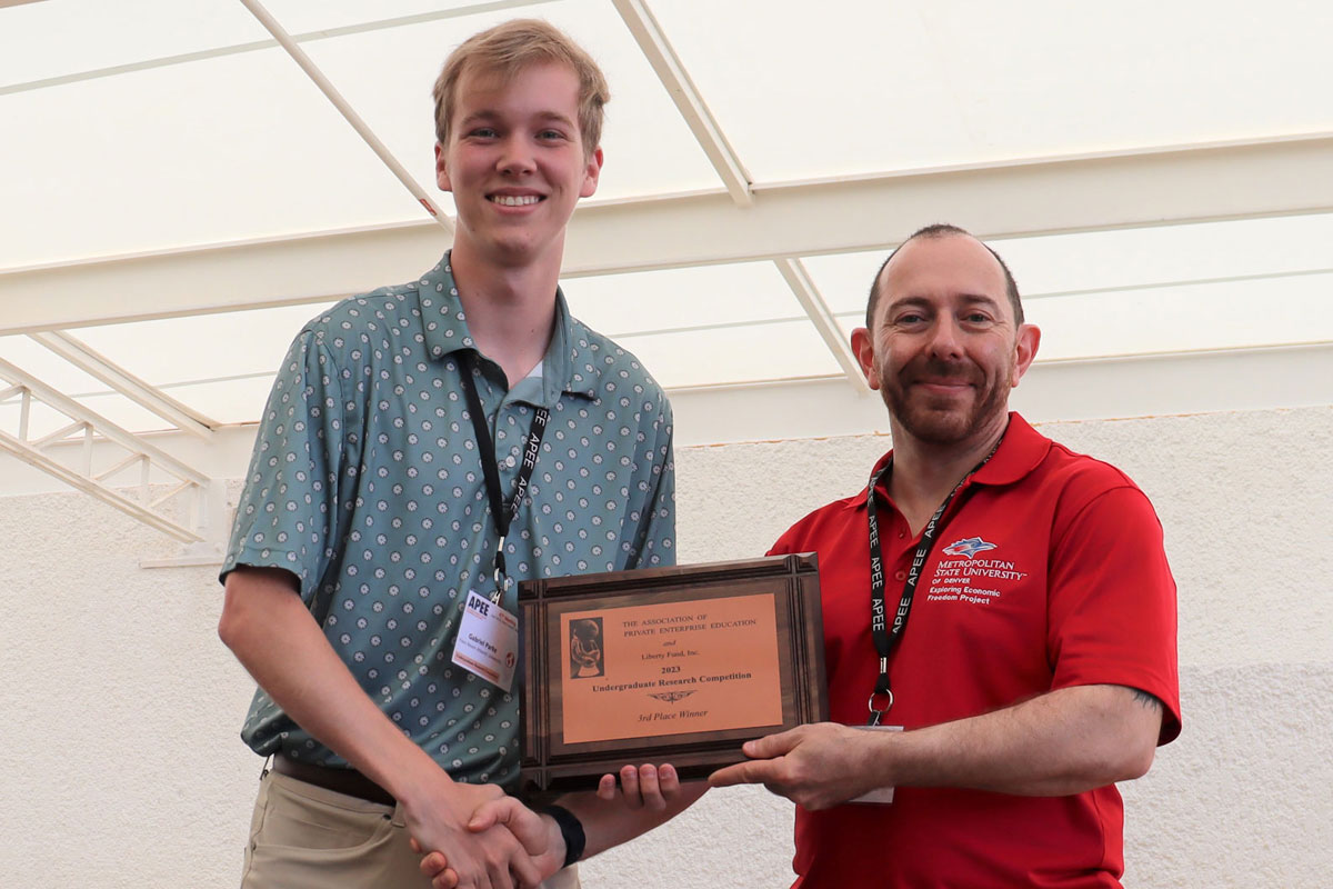 APEE is an association of teachers and scholars from colleges and universities, public policy institutes, and industry with a common interest in studying and supporting the system of private enterprise. The Undergraduate Research Competition encouraged research on the association’s general themes of political economy, private enterprise education, and free markets, although research on any topic was certainly welcomed. APEE helps foster a deep appreciation for private enterprise and its role in society, and it brings together bright minds from across the country, allowing them to showcase their groundbreaking research.
